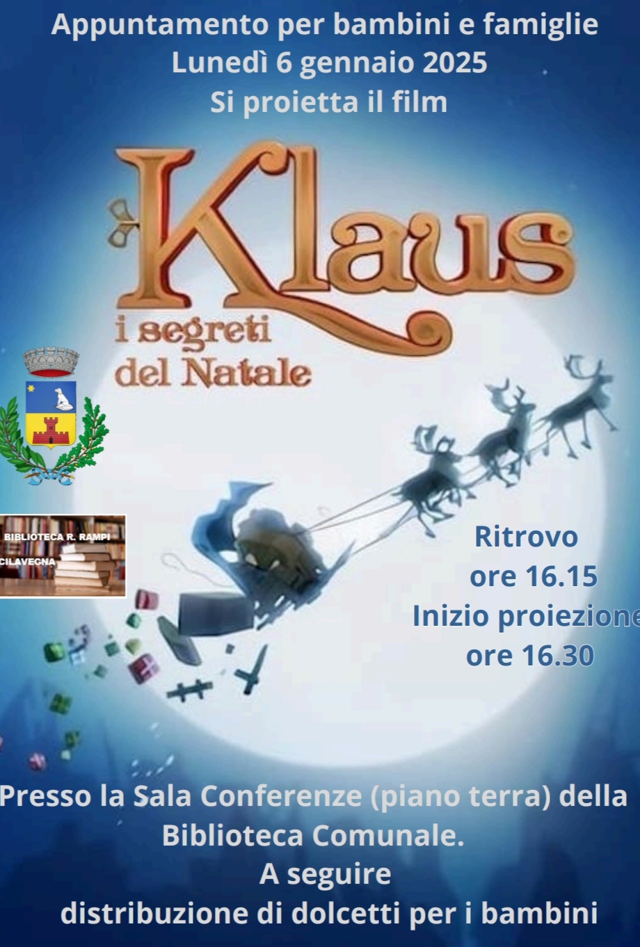 Il 6 gennaio alle ore 16,15 (inizio film alle 16,30) Proiezione del film "Klaus - I segreti del Natale" presso la sala conferenze della Biblioteca.