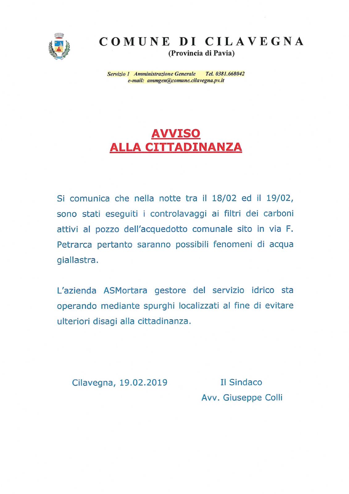 Avviso per controlavaggi ai filtri dei carboni attivi al pozzo dell'acquedotto comunale nella notte tra il 18 e 19 febbraio.