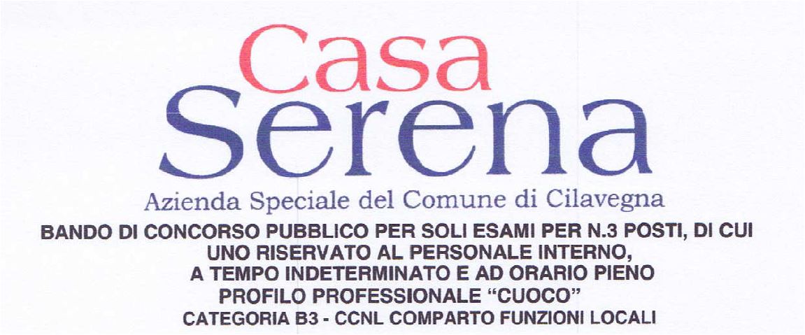 Concorso pubblico per soli esami per copertura n. 3 posti di "Cuoco" - Cat. B3 - CCNL Funzioni Locali presso la RSA "Casa Serena - Azienda Speciale del Comune di Cilavegna".