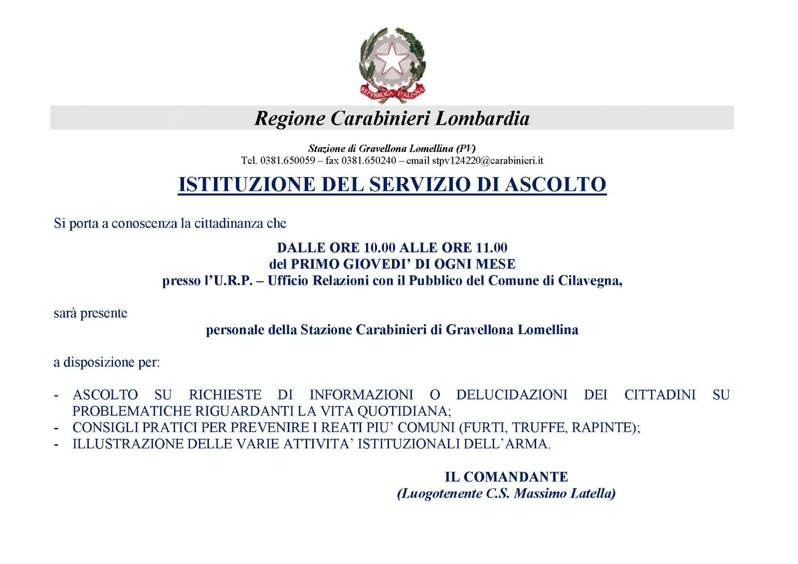 Dalle ore 10.00 alle ore 11.00 del primo giovedì di ogni mese, presso l'URP sarà presente personale della Stazione dei Carabinieri di Gravellona Lom. per richieste informazioni e consigli pratici.
