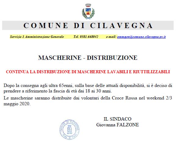 Si ribadisce che la divisione in fasce d’età è dovuta alla disponibilità limitata di numero delle mascherine. Le mascherine disponibili non avrebbero potuto coprire il numero dei 50enni. Nel frattempo verranno distribuite altre mascherine presso i vari commercianti di Cilavegna perché le distribuiscano ai loro clienti: trattasi di mascherine chirurgiche.
